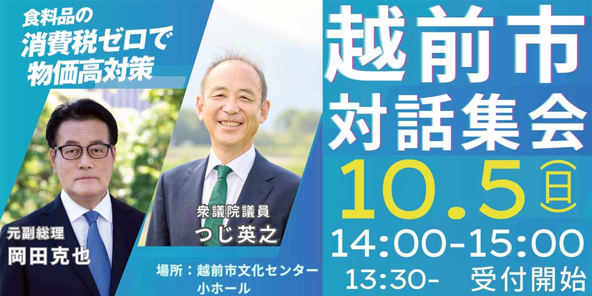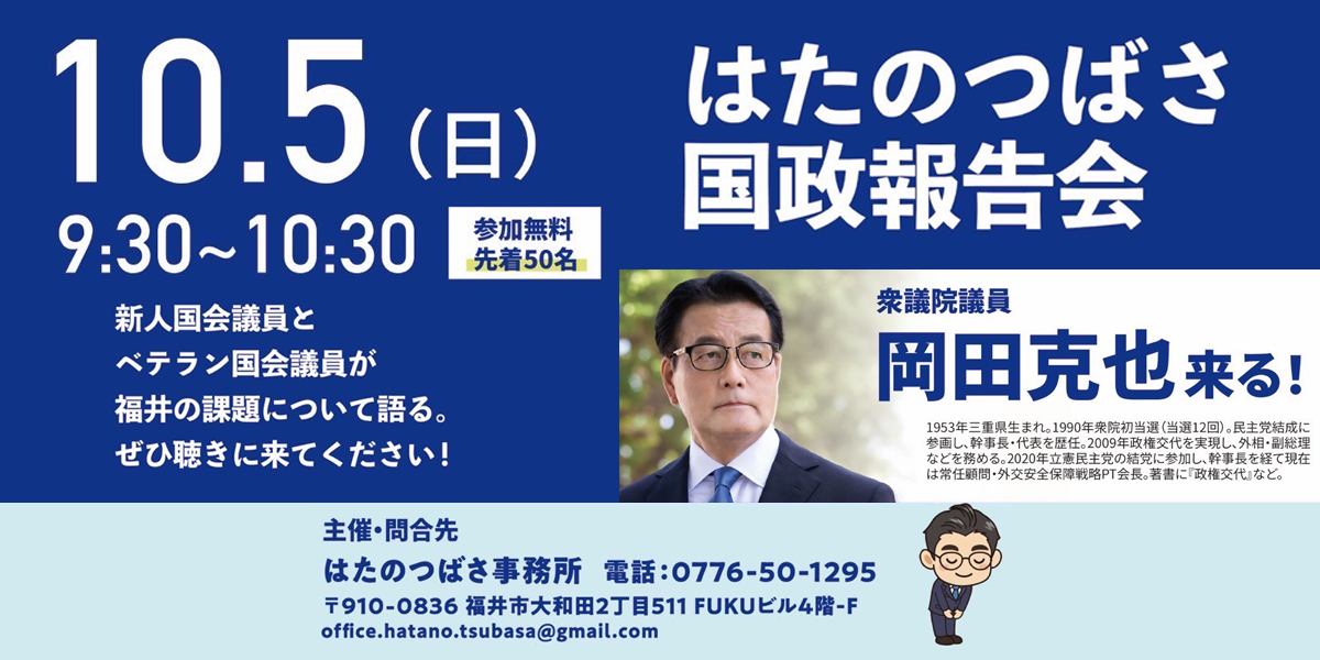 10月5日(日)に立憲民主党の”岡田克也衆議院議員”の来福が決定いたしました。